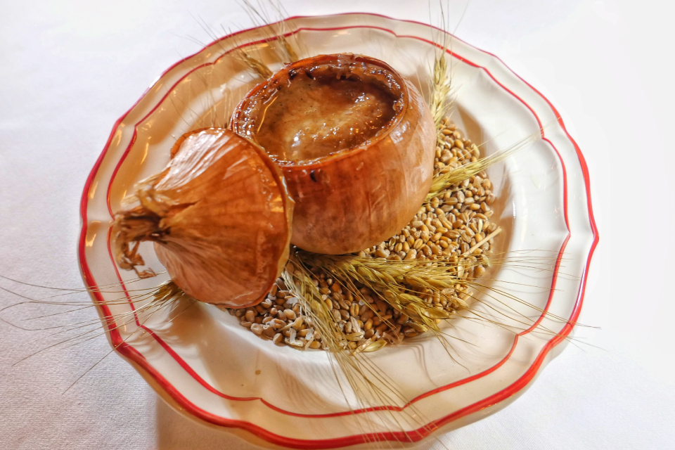 Ладно, давайте о том, что тут есть французского. Пате ан крут из четырех видов мяса — отлично, особенно под рюмочку сотерна. Луковый суп — вполне (хотя, конечно, это уже общее место — подавать луковый суп в луковице, а тыквенный в тыкве, но это ничего). Ну и бриошь с говяжьим тартаром к нему как-то не очень. Петух в вине исполнен канонически, знатоки должны оценить.