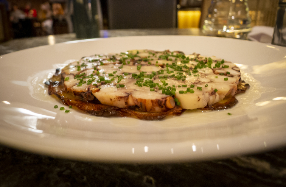 Еще один хит — нарезанные тонкими шайбами щупальца осьминога на подушке и из еще более тонко, буквально как бумага нарезанного картофеля (950). Осьминог присутствует и в разделе закусок в виде карпаччо. При этом под воздействием содержащегося в нем желатина он становится похож не столько на карпаччо, сколько на заливного осьминога (это комплимент такой, если что).