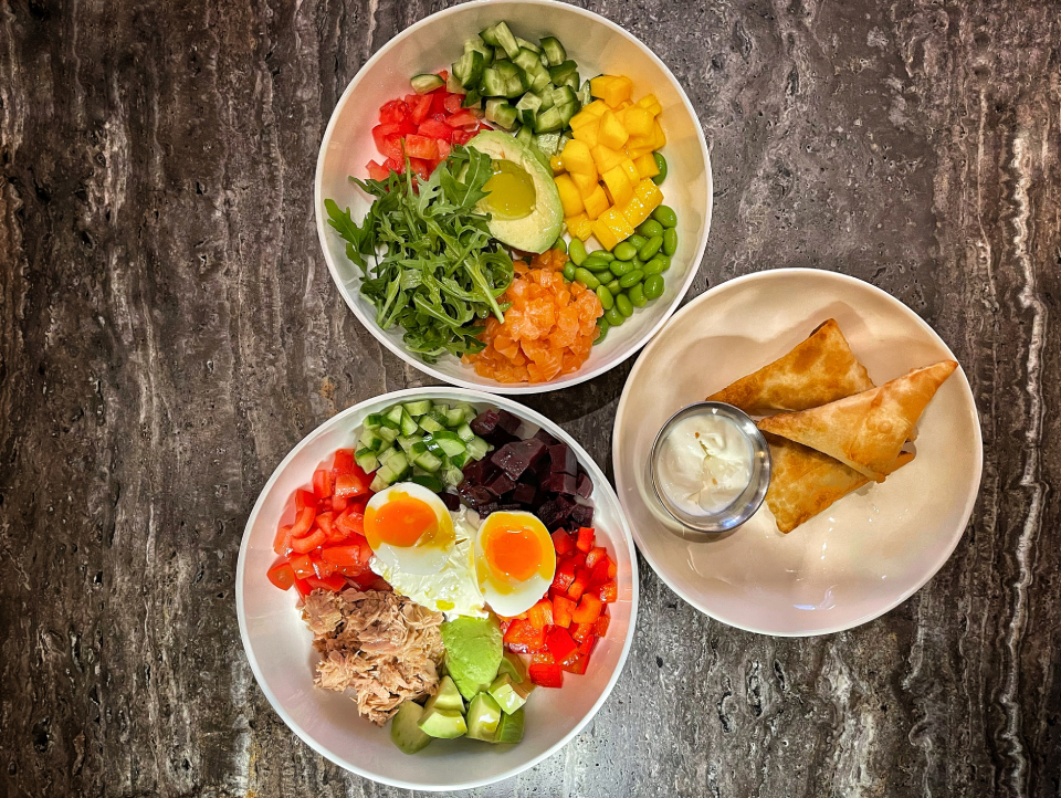 Жареные пирожки самосы с картошкой (250) это прямо-таки вкус детства, хотя лично я в детстве и слова такого не знал — самосы. Салаты живописны, фотогеничны и содержат почти все компоненты ЗОЖ — от авокадо и киноа до эдамаме и кейла. В салате с тунцом (650) неожиданно ярко выступает свекла.