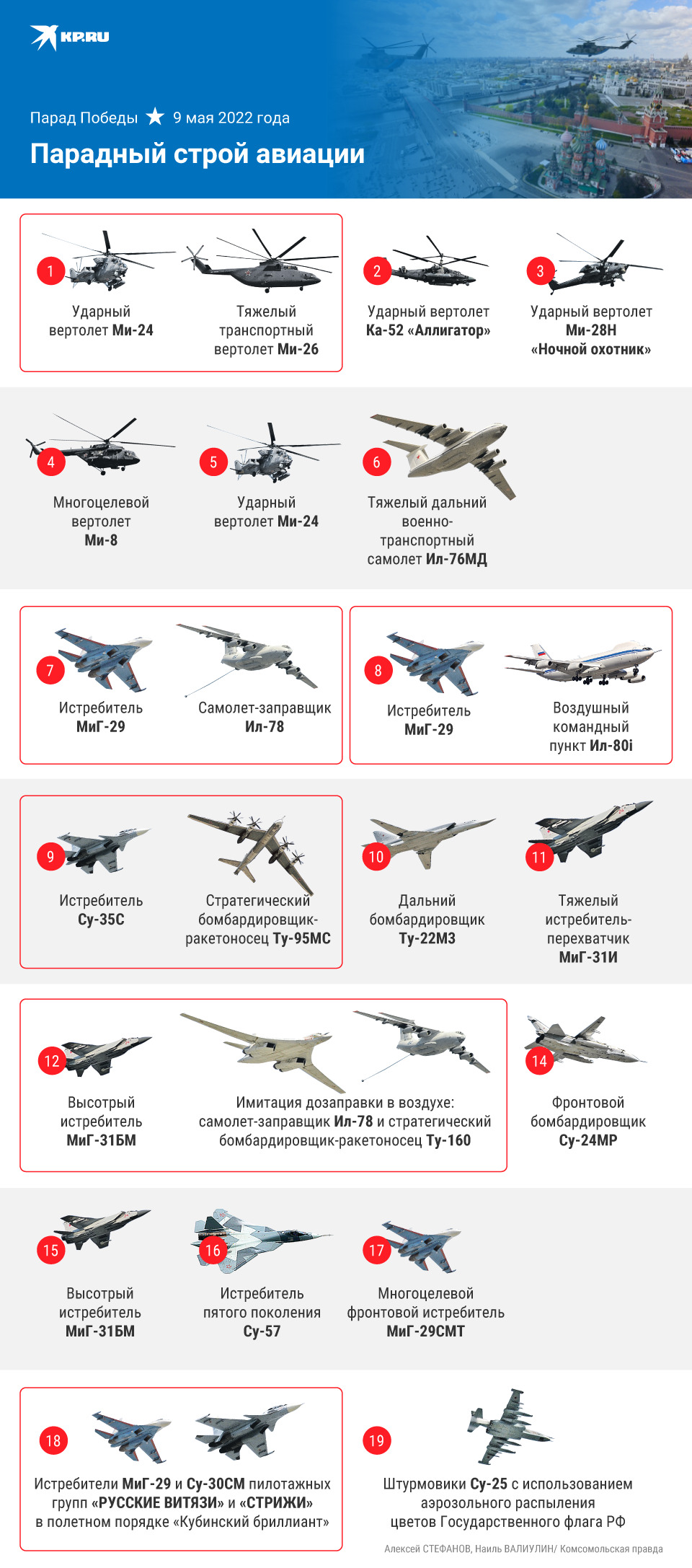 В небе москвичи и гости столицы могли увидеть воздушный пункт управления Ил-80. Его называют еще «Самолетом судного дня». На его борту есть аппаратура для связи со всеми видами войск, даже если будет уничтожено все наземное и спутниковое сообщение. Это летающий штаб на случай ядерной войны. В крылатом строю над столицей могли также пронестись истребители 5-го поколения Су-57 и стратегические ракетоносцы Ту-95МС и Ту-160 «Белый лебедь» в паре с «воздушным танкером» Ил-78.