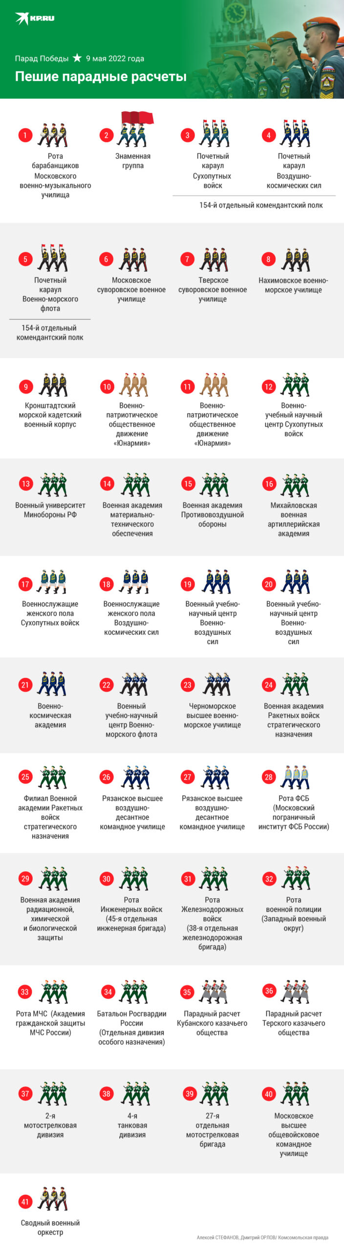 Как и всегда, парад открыли пешие расчеты. Их было 33. В них были представлены все виды Вооруженных сил и рода войск, юнармейцы, курсанты и даже казаки.