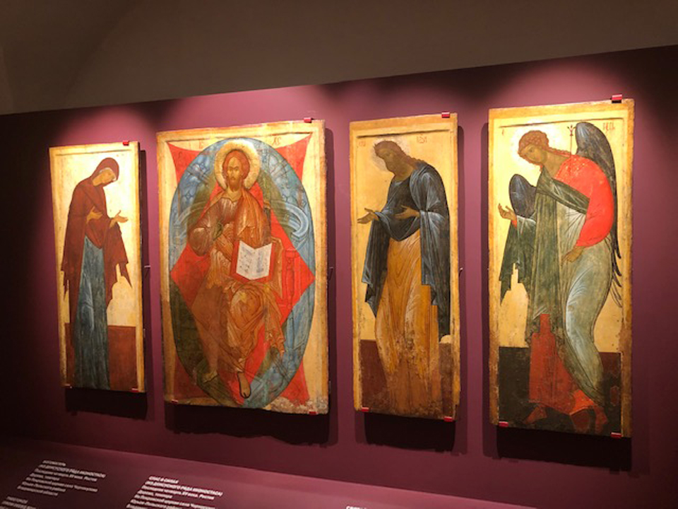 В «Ночь искусств» экскурсионные прогулки по выставкам и монастырю были рассчитаны на 30 минут. В реальности же экскурсоводов не отпускали гораздо дольше. На основной экспозиции показывают самый цвет коллекции музея – иконы, созданные в 12-13 веках. Каждый экскурсовод делает акцент на чем-то своем. Один объясняет, как определить, что действие сюжета происходит внутри дома, другой обращает внимание на жертвоприношение в чаше, стоящей в центре стола, за которым сидят ангелы знаменитой Троицы.