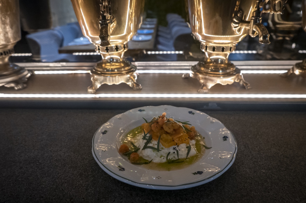 В главном сибирском заведении Москвы затеяли фестиваль якутской морошки. Как оказалось, ягода эта чрезвычайно универсальна и подходит буквально ко всему: хоть к сахалинскому гребешку с икрой морского ежа (780), хоть к страчателле с хурмой (780), хоть к оленьей вырезке со сладкой тыквой (980, тут морошка выступает в качестве основы для соуса на белом вине).