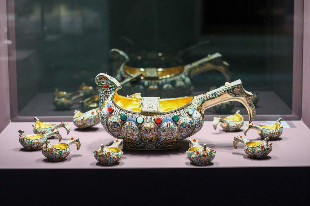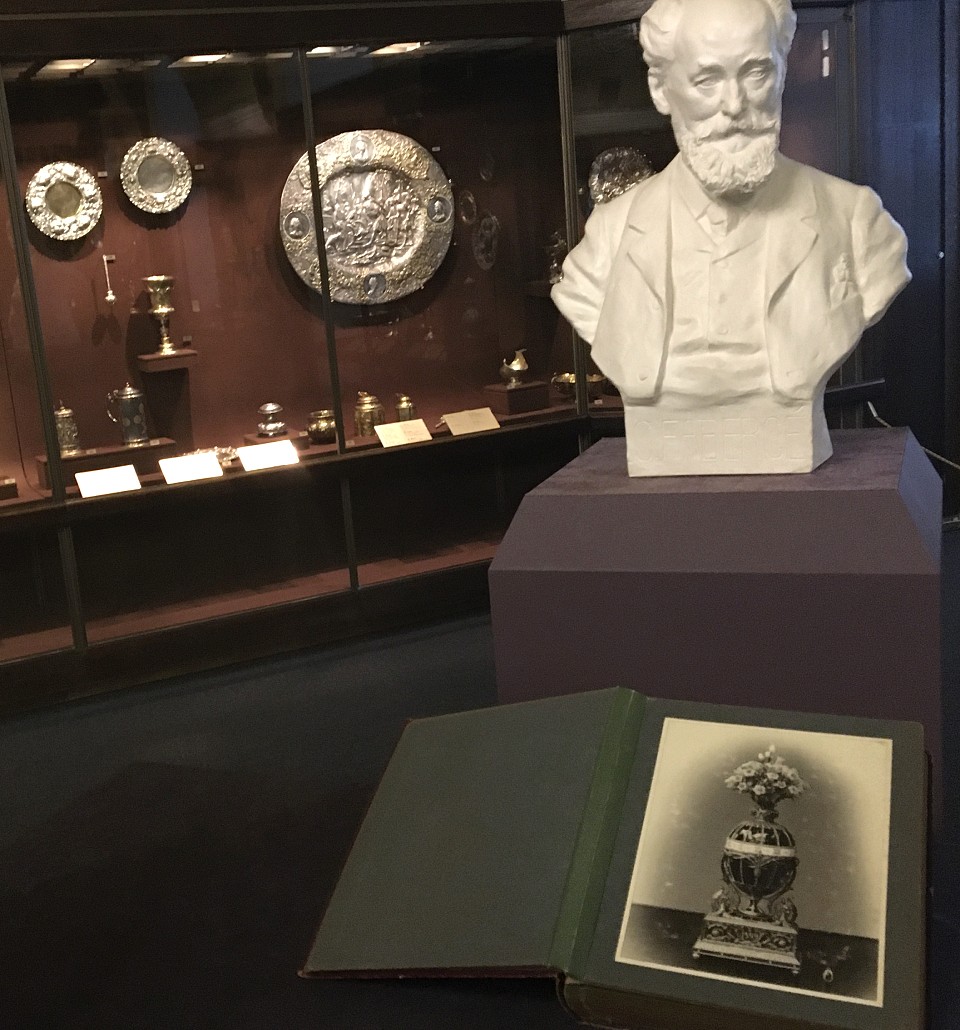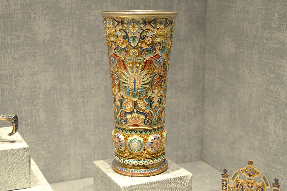 Среди экспонатов — «московские» изделия Фаберже, выполненные в русском стиле — ковши, чарки, ларцы, шитые жемчугом по матовым эмалевым фонам, похожим на бархат.
