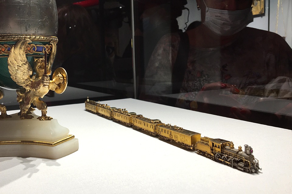 Символ кремлевской коллекции — пасхальное яйцо «Московский кремль», которое заводится ключиком и исполняет Херувимские мелодии композитора Кастальского. Но меня поразило яйцо «Сибирский поезд». Сюрпризом, вложенным в белоснежную эмалевую скорлупу, оказался целый железнодорожный состав из пяти золотых вагончиков и платинового локомотива. Окошки в вагончиках сделаны из горного хрусталя, в лупу видны надписи: купе для курящих, некурящих, купе 1 класса, 2 класса, купе для дам. Последним прицеплен вагончик-церковь, внутри которого можно разглядеть колокола на веревочках. Поезд заводится золотым ключом, после чего весь состав, сверкая бриллиантовыми фарами и рубиновым фонарем, приходит в движение.
