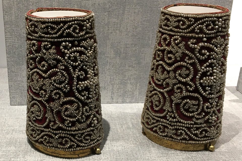 Расшивка жемчугом — абсолютное ноу-хау мастера. Он нанизывал жемчуг на проволоку, затем выгибал нужный узор и поперечными стежками, практически как швея, прикреплял к поверхности серебра.