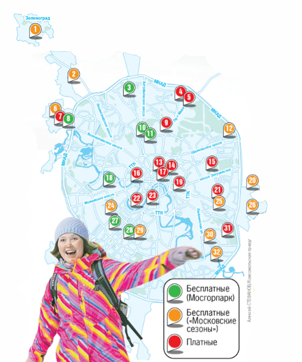 Парк «Ходынское поле» Где: Ходынский б-р, 1. Ст. м. «ЦСКА». Когда: ежедневно с 10.00 до 23.00. Стоимость: от 200 до 350 руб., в зависимости от сеанса. Дети до 6 лет бесплатно. Прокат коньков: 200 руб./час. Купить билет