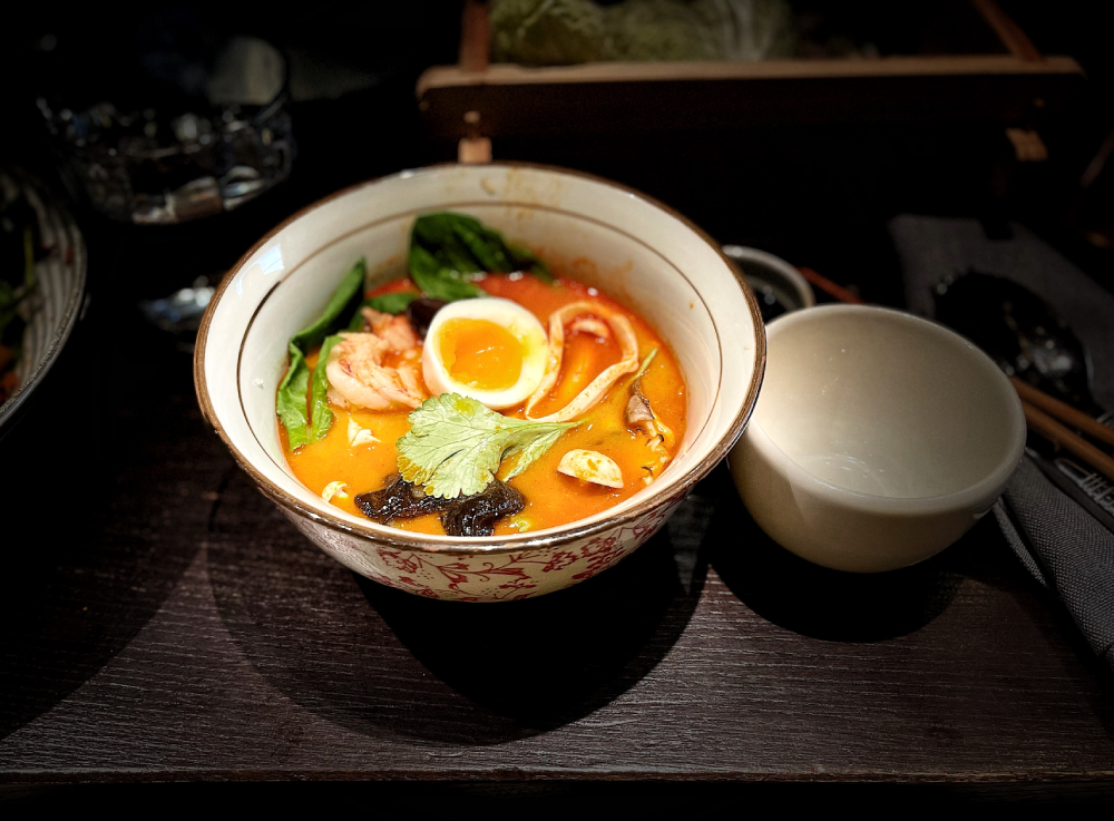 Это такой довольно приятный во всех смыслах аттракцион. Вам на стол водружают конструкцию (на наш самовар она похожа не столько внешне, сколько принципом действия). Там чаша, в которой кипит бульон. Можно выбрать — мисо (2700 р) или том ям (3000, он поострее и вообще поинтереснее). Не очень-то китайские варианты, ну да ладно. В бульон гости кладут разные вкусности — сырые овощи, мясо, морепродукты, доводят их до ума, потом раскладывают по своим тарелкам вместе с бульоном и едят.