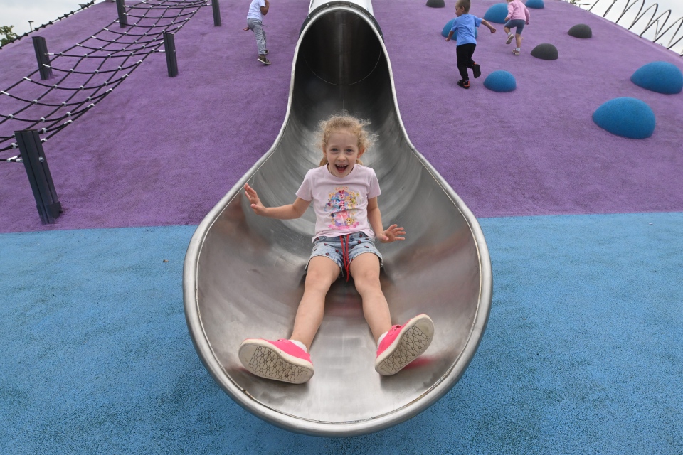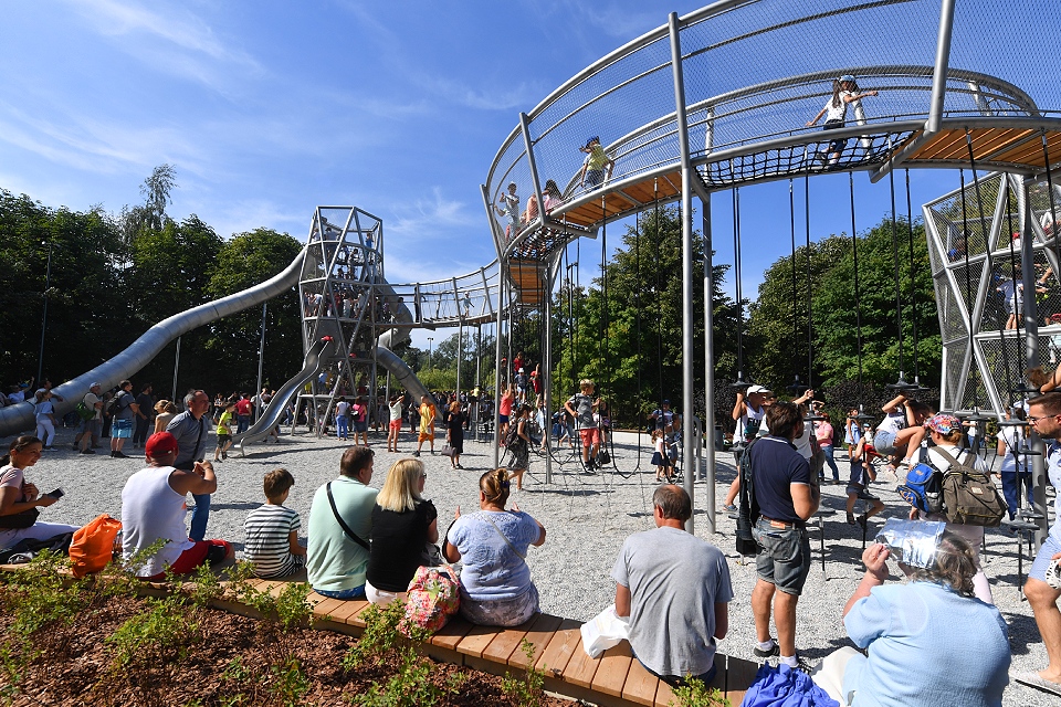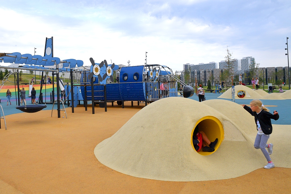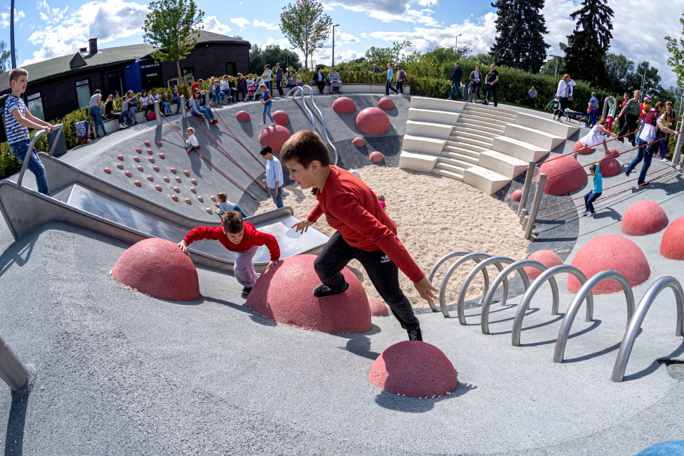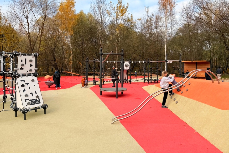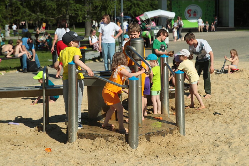 Детей ждут 12 игровых зон, в том числе для детей с ограниченными возможностями. Одна из них включает игровой комплекс в виде замка — с горками и скалолазными элементами. В других местах есть искусственные холмы, вращающиеся цилиндры и 50-метровая тарзанка с песчаным покрытием. Помимо игровых пространств, здесь обустроили 12 спортивных площадок — для волейбола, баскетбола, бадминтона, настольного тенниса. Есть тренажеры, профессиональный скейт-парк и скалодром. В теплое время работает прокат велосипедов и самокатов.
