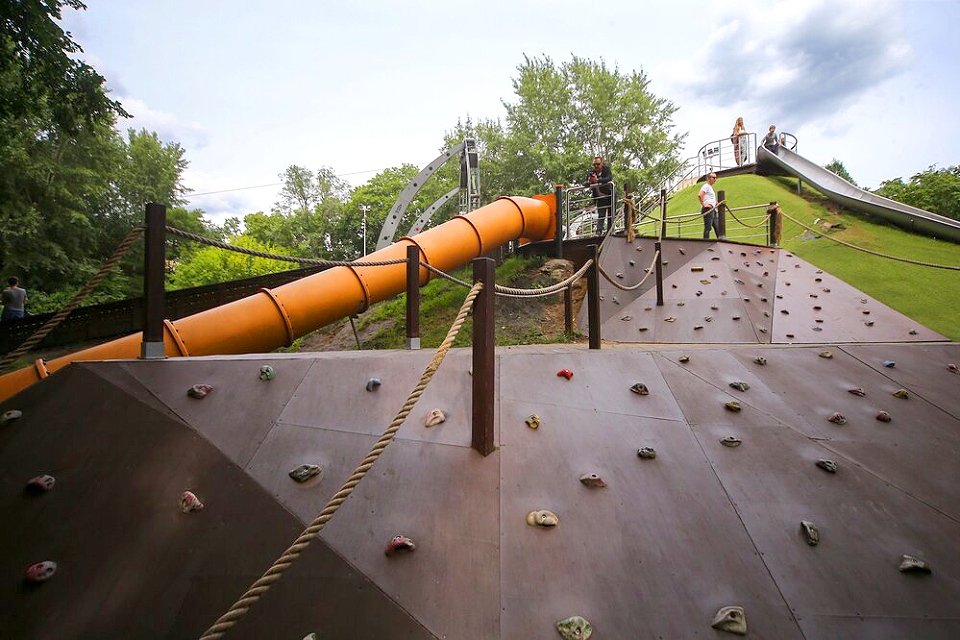 Первая зона площадки — для детей от 3-х до 7 лет с полосой препятствий, канатной башней с горкой, каруселью, батутами, качелями и развивающими панелями. Вторая зона — это двухуровневый кластер для детей от семи лет. На нижнем ярусе — основное игровое пространство. Здесь дети могут рисовать мелками, лазать по канатным комплексам, кататься с горок на искусственных холмах с тросами для подъёма. Площадка также включает в себя спортивно-модульный комплекс для паркура и гимнастики. Кроме того, есть 14-метровый подвесной мост, тоннели, пружинные качалки, большая песочная фабрика с экскаваторами.