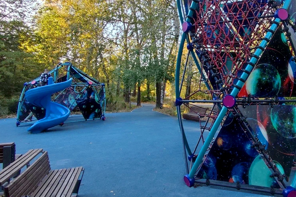 Площадку построили на склоне, так что с ее верхней точки открывается вид на реку Шмелевку. Детей ждут батуты, качели-балансиры, канатная дорога и горки, а еще — резиновые полусферы, карусели, гамаки и песочницы. Подпорная стенка превращена в полосу препятствий — с зацепами, ступеньками, сетками. Для малышей доступны интерактивные панели и меловая доска.