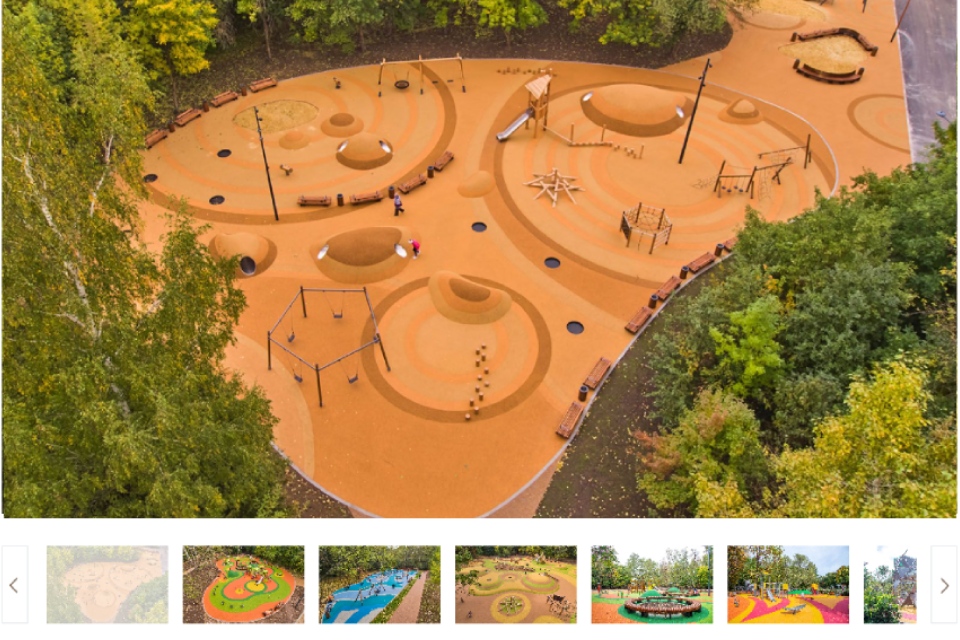 Площадка подходит и для детей с ограниченными возможностями: есть карусель для инвалидных колясок с безбарьерным заездом, велотренажер для рук, яркое зонирование и тактильные приспособления для слабовидящих.