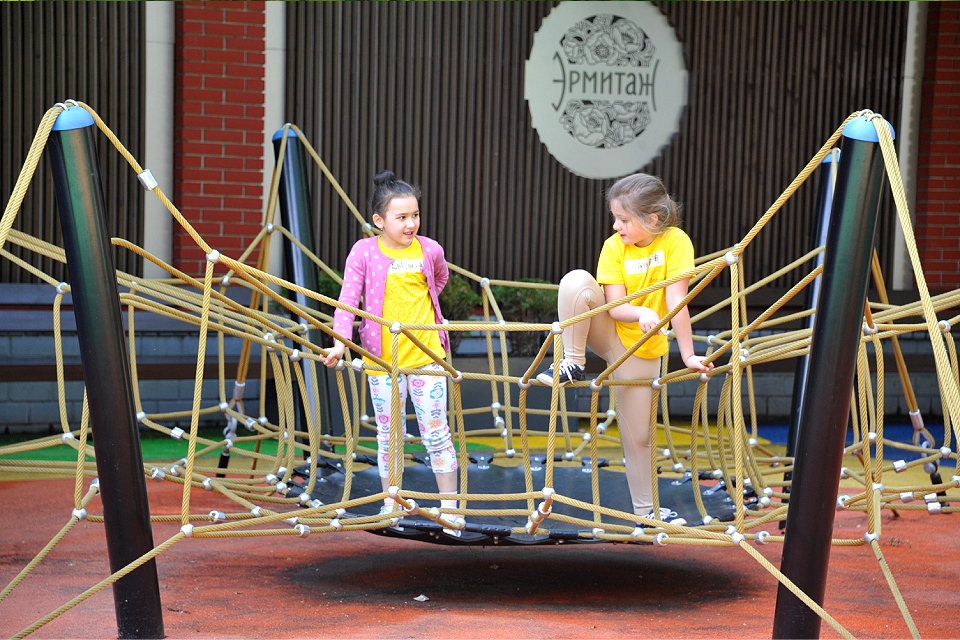 В Саду «Эрмитаж» найдутся активности для детей разных возрастов. Например, можно прокатиться с горки в виде аиста; покрутиться во вращающемся цилиндре или поймать баланс на подвесном комплексе. Также работают спортивная секция с веревочной лестницей и паутиной, а ещё — карусель, игровой лабиринт для малышей, батуты и песочница.
