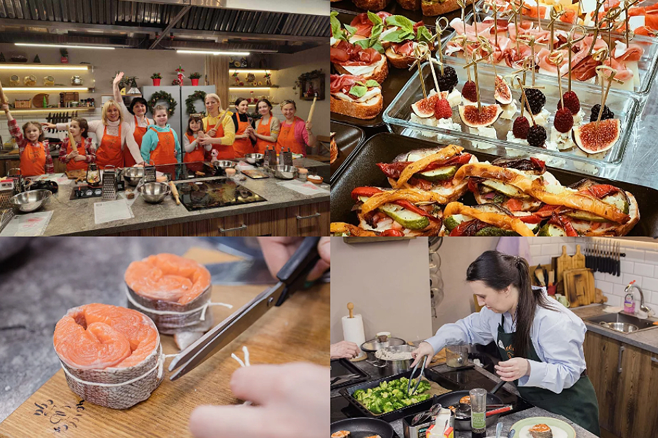 В кулинарной студии Юлии Высоцкой представлено множество различных мастер-классов — от завтрака для двоих с классической шакшукой и фисташковым рулетом до ужинов в традиционном русском стиле. Можно научиться готовить пиццу или филе лосося.