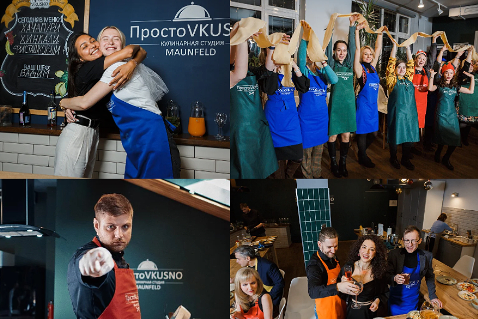 Есть много мастер-классов, посвященных грузинской кухне, что встречается на так часто. Гости будут делать хачапури по-аджарски и хинкали. Занятия начинаются с приветствия и раздачи фирменных фартуков, это тоже задает позитивный настрой на работу. Все проходит под музыкальное сопровождение, а в конце обязательно общее фотографирование на память.