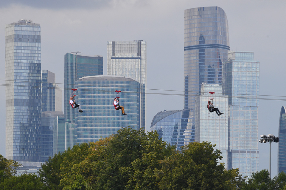 Скорость спуска достигает 60 км в час. За 40-60 секунд желающие увидят столицу с новых ракурсов – от Нескучного сада до Москва-Сити. Маршрут завершается на крыше нижней станции канатной дороги «Лужники».