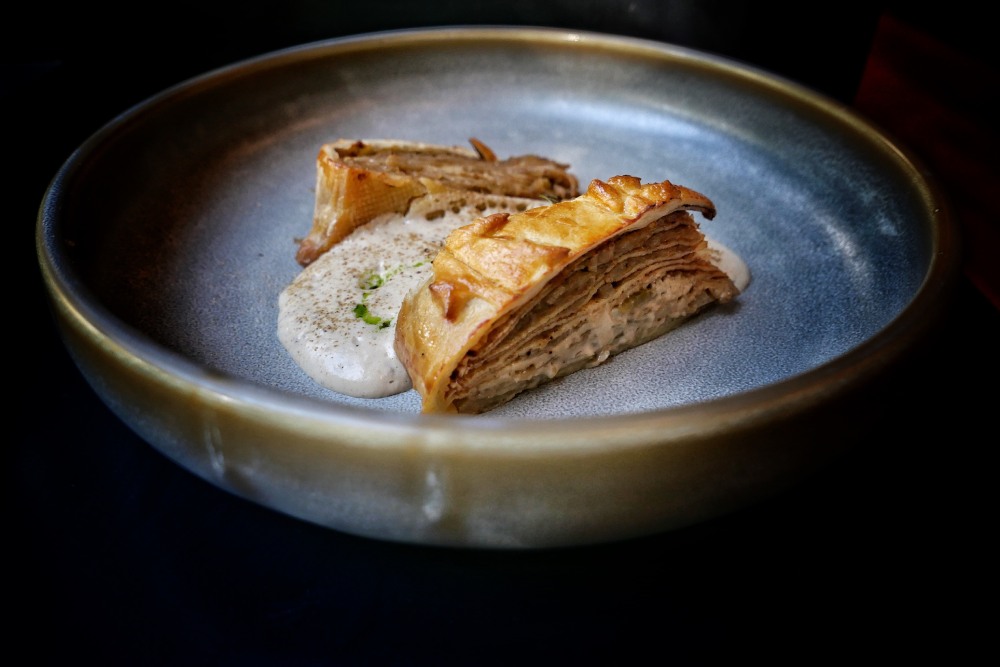 И не пропустите совершенно потрясающий слоеный рыбник с налимом и щукой с муссом из жареного картофеля (слоеный капустник не менее потрясающий).