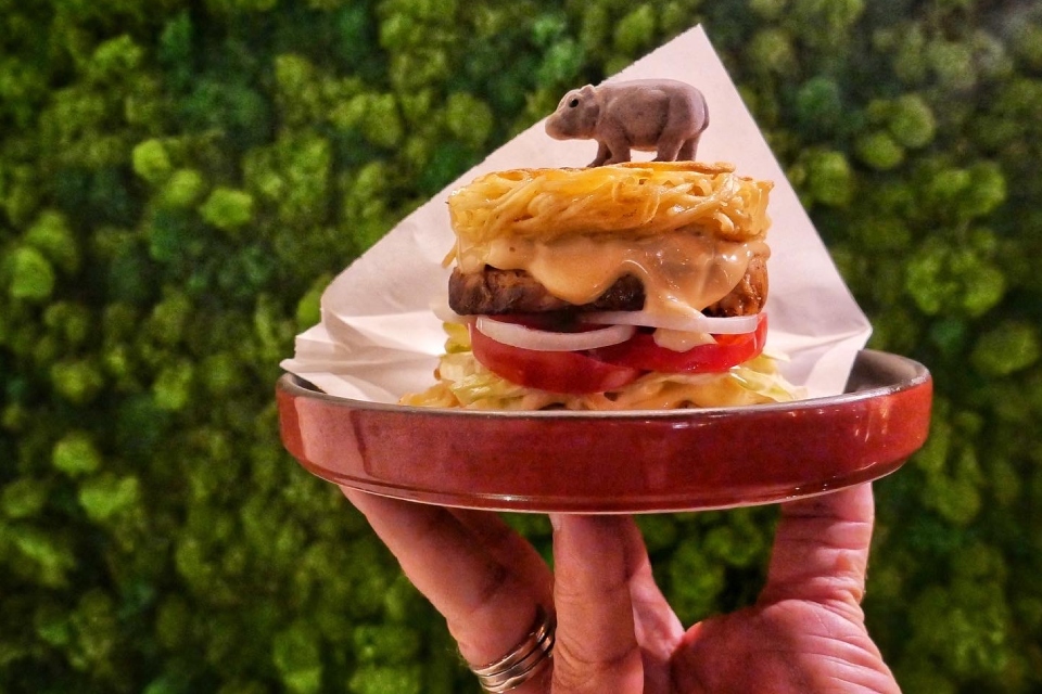 Продолжаем отмечать уход McDonald’s поисками новых интересных бургеров (как будто кто-то жить без них не может). В [KU:] Ramen готовят рамен-бургер. Вместо булок — отваренная и затем обжаренная на теппане лапша, внутри вместо котлеты рулет из томленой свиной шеи, нарезанный шайбами (вообще с этим рулетом довольно мудреная история, готовят его долго, но мы эти детали опустим, поскольку повторить процесс самостоятельно не получится). Томаты, латук, маринованные огурчики. В качестве соуса — японский майонез со сложными добавками. Говорят, в Японии это популярный стрит-фуд. Довольно вкусно и очень молодежно.