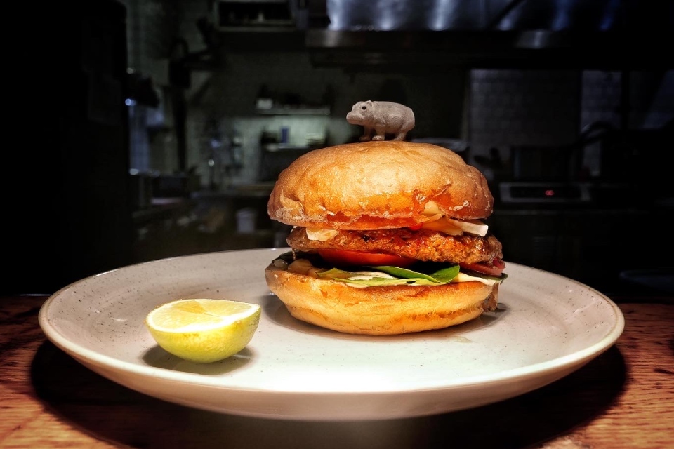 А вот гамбургер с котлетой из лося, камамбером и шпинатом в «СибирьСибирь» — это уже для взрослых и серьезно настроенных мужчин. Большой, солидный, тяжелый. Кусать его, конечно, неудобно, как и все бургеры, но понятно ведь, что тут заложена идея некоторой брутальности (что-то в духе «настоящий мужик не боится рот раскрыть пошире»). Зато уж если откусил — будет тебе счастье. Разобрать все ингредиенты непросто, но, кажется, где-то там внутри есть волшебный конфитюр из лука. Котлета, кстати, тоже отличная.