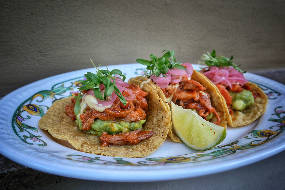На кухне — Марко Антонио Феррейра. То, что вполне можно было бы назвать севиче из сибаса, скромно называется «сибас/личи/огурец». Удобнее есть ложкой (соус очень вкусный). Много авокадо в разных видах (а вы как хотели — все-таки Глен Баллис за кулисами, всенародно избранный Avocado King). Буррито в виде закрытой трубочки с приятной пряной начинкой сопровождается фалангой краба (ее, кажется, слегка обжарили на сливочном масле и получилось очень хорошо). Кесадилья с рикоттой. Снаружи хрустко, внутри мягко. Жареный на гриле сибас без костей (хоть кто-то о нас, простых едоках, заботится), но зато с чрезвычайно приятной корочкой. Тако четырех видов. Которые с уткой и фасолевым пюре — очень даже ничего, на остальные придется зайти еще раз. И на спаржу с кукурузной сальсой тоже. И на осьминога с гуакамоле.