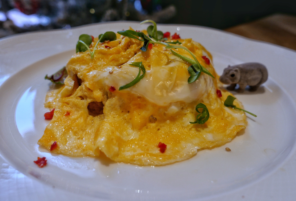 Чтобы придать любому блюду признаки завтрака, вовсю используют яичную тему. Не всегда по делу. Например, корейскую говядину пульгоги не обязательно накрывать омлетом. Примерно та же история с швейцарским фермерским цыпленком, которого под яйцами вообще не видно. К кальмару с соусом чимичурри прилагаются вафли из батата. Тоже, прямо скажем, не эталонное сочетание, но в данном случае это скорее хорошо.
