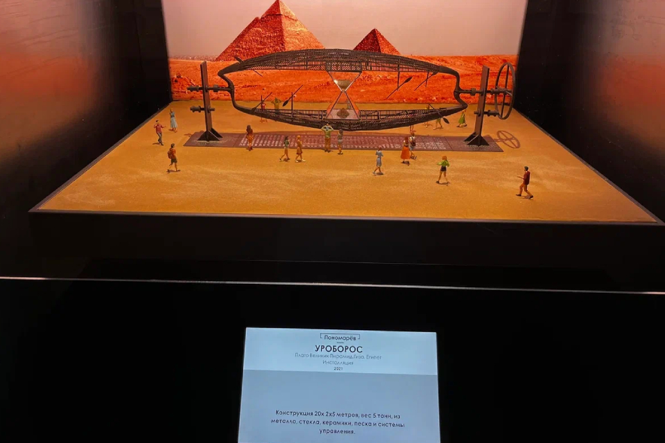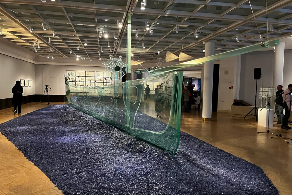Но центральное место выставки занимает настоящее чудо инженерной мысли — прозрачный стеклянный корабль, качающийся в синих водах стеклянных же морей. Это «Хрупкость плывущего мира» — внешне непрочный, но при этом мощный объект 15-метровой длины. Корабль словно уплывает, не в силах сопротивляться норд-норд-весту — ветру, название которого звучит в заглавии выставки. «Я безумен только в норд-норд-вест» — цитата шекспировского Гамлета, героя любопытствующего и ищущего, не довольствующегося простым объяснением, а стремящегося непременно добраться до сути вещей.