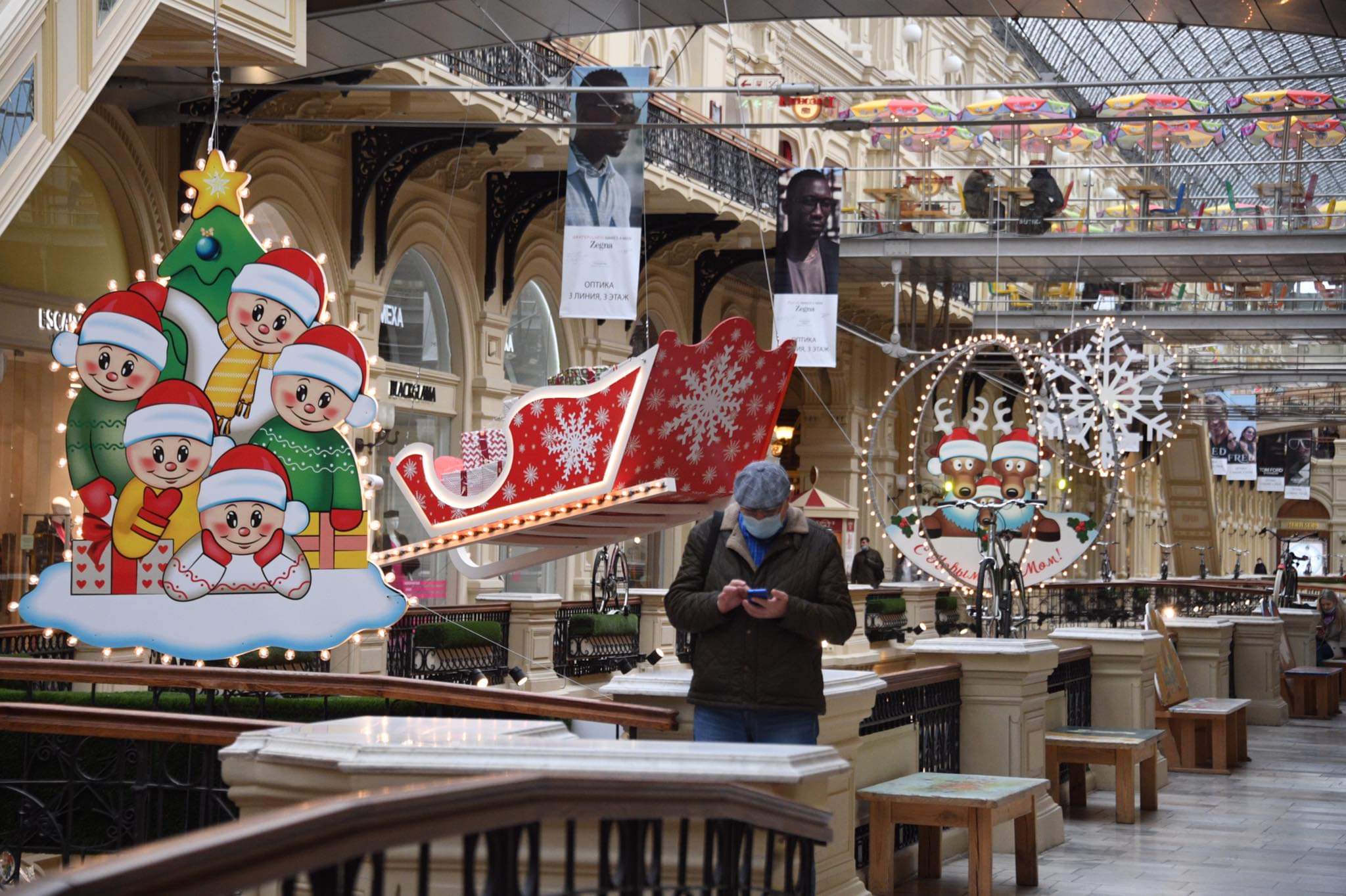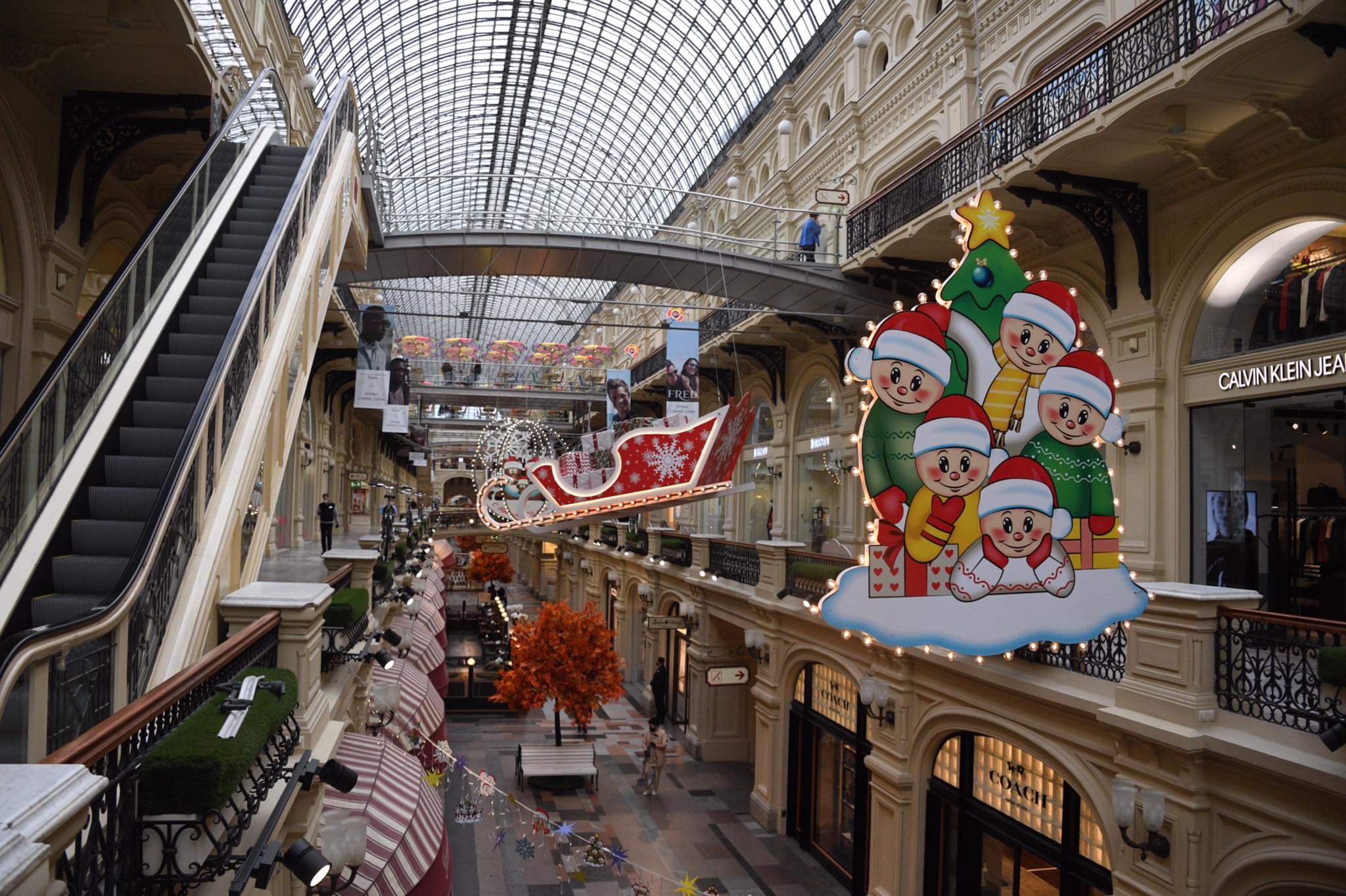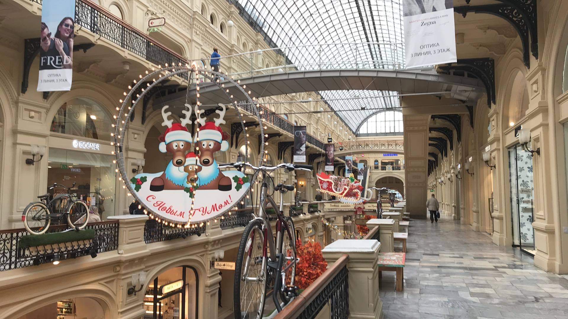 За окном еще багровые листья, а в главном магазине Москвы – праздничное настроение. В ГУМе возле Красной площади появились новогодние украшения – олени в красных шапках, гирлянды, елочки, коробки с подарками, сани Деда Мороза.