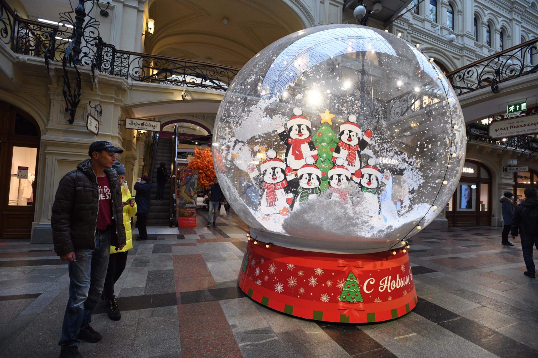 И москвичи, гуляющие в магазине, стали с удовольствием делать фотографии с большими прозрачными шарами, в которых веселые пингвины окружили елку и машут перчатками, сквозь снег, москвичам и гостям города.
