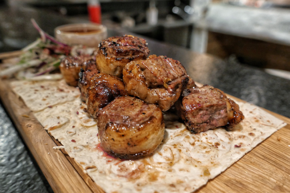 Весь набор понятной Грузии на месте: пхали, хинкали, сациви, хачапури, шашлыки и пр. Вроде всё до боли в желудке знакомо, но нет. Я вот, например, выяснил, что лалеби — это не только песня «Ореро», но еще и овощной салат с языком и виноградом, а чвиштари — более приятная версия курурузных лепешек мчади. Если шашлыки вам уже поперек горла, берите царский шашлык из тонких ломтей телятины со спинным бараньим жиром. Но лучше всего шеф-мангальщику «Ткемали» Эмилю Каримову удается хан-кебаб. Взять его, чачи — и никакой Сосо Павлиашвили вам не страшен.