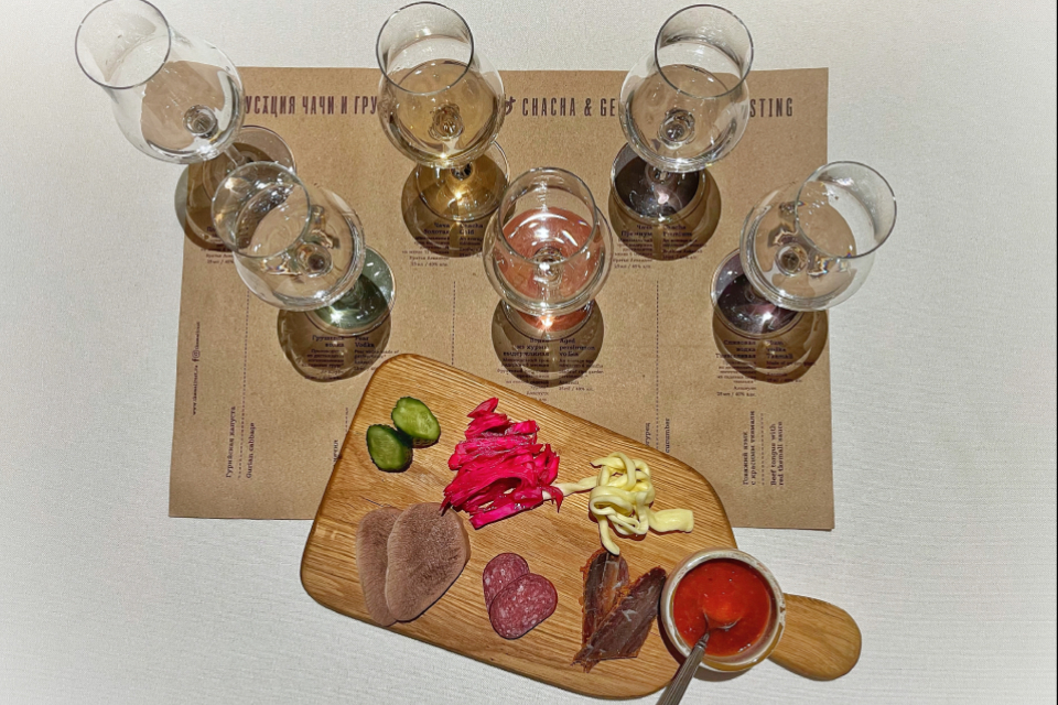 На днях под пение Сосо Павлиашвили открылся еще один «Ткемали» — на месте «Ноева ковчега». Успел заскочить до начала веселья. Проверил, жива ли самая красивая традиция «Ткемали» — дугустационный сет чач из грузинских водок. Сначала вам приносят лист бумаги, там кружочками обозначены места, где будут стоять рюмки: с чачей платиновой и золотой, водкой из хурмы и сливы и т.д. От каждого кружочка — стрелочка-подсказка, какую рюмку чем лучше закусывать. Потом ставят рюмки и на дощечке приносят закуски — гурийскую капусту, огурец, сыр, бастурму и прочие радости. Жива традиция, но действует только с 12 до 16 (объясняют тем, что процесс трудоемкий, бармен в вечернее время не справляется).