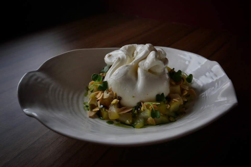 В последнее время Игорь Котов нам знаком по «Русскому винному бару» (а в предпоследнее — по французскому ресторану Geraldine). Его недавно позвали консультировать кухню в ресторанчике Velvet на Трубной улице, но быстро поняли, что лучше, если Игорь кухню не консультирует, а возглавляет. Ну он и возглавил. Захватил несколько своих хитов, на которые в РВБ люди ходят специально — например, индейку в соусе тоннато, маринованную в свекольным соке (теперь еще добавился апельсиновый соус). Эклеры с приятными начинками — оттуда же. Отличная буррата хорошо сочетается с шафрановой грушей.