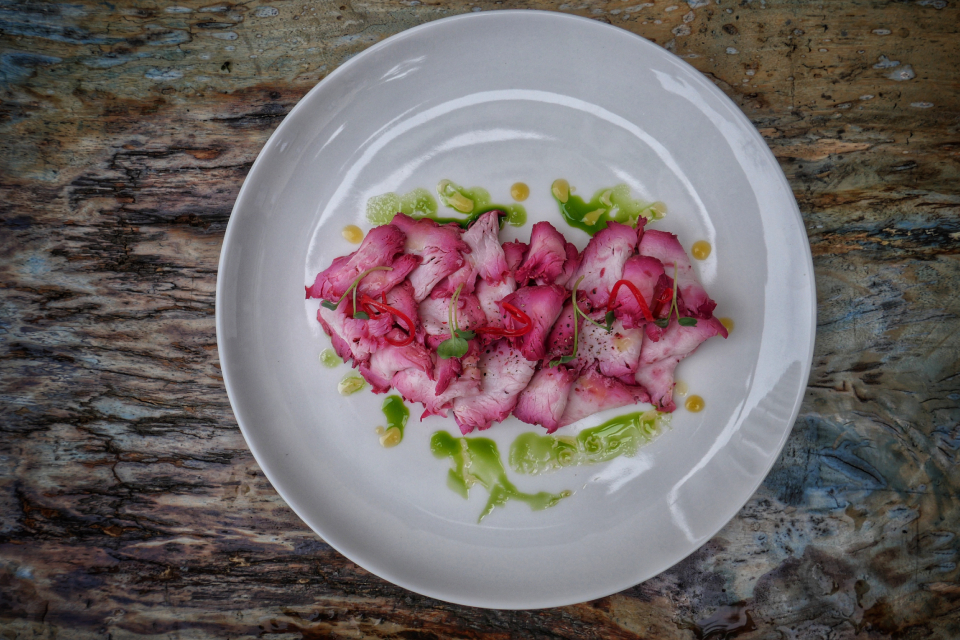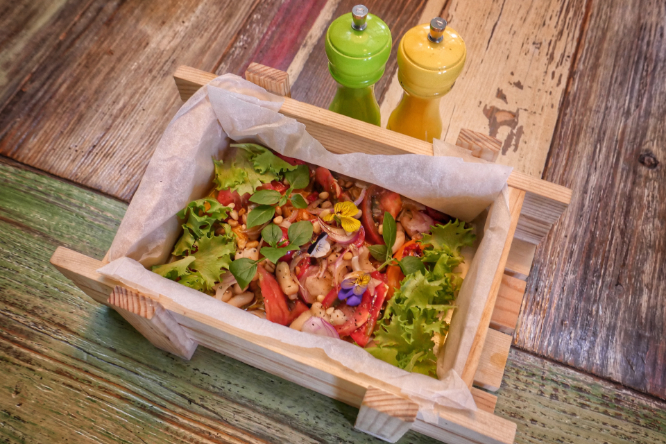 В новом меню Christian есть ужасно симпатичная закуска с довольно несимпатичным названием — «ящик с разными помидорами и фасолью». Там и правда небольшой деревянный ящичек, а в нем помидоры разных цветов и размеров и белая фасоль каннелини под приятной легкой заправкой. Лето в чистом виде. В хлебный суп аквакотта (еда итальянских бедняков, как мы знаем) для усиления народности добавлены петушиные гребешки, хотя если этого не знать, их можно и не заметить — мелковаты кусочки. Лучше бы целиком (в Литве их так подают к пиву), но тогда есть шанс у многих вызвать отторжение — продукт все-таки специфический.