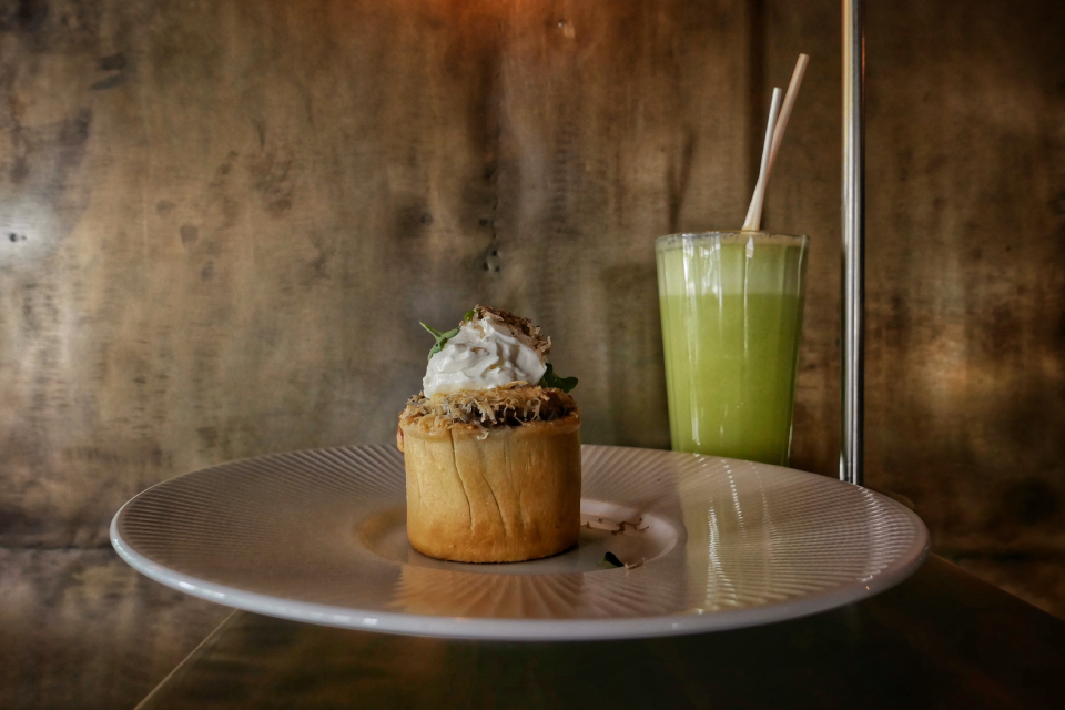 Лотарингский пирог с мясным фаршем прикрыт корочкой запеченного сыра, поверх которой еще и трюфельная пена. Как по мне, мясная начинка могла бы быть и более пряной. Но в целом — хороший вариант. В том числе и потому, что компактный и не слишком сытный. Есть еще омлет со щечками, шакшука с ними же, блинчик с мясом. Ко всему прочему тут еще затеяли (но уже не на завтрак) какую-то чудо-шаурму, тоже надо будет попробовать и написать.
