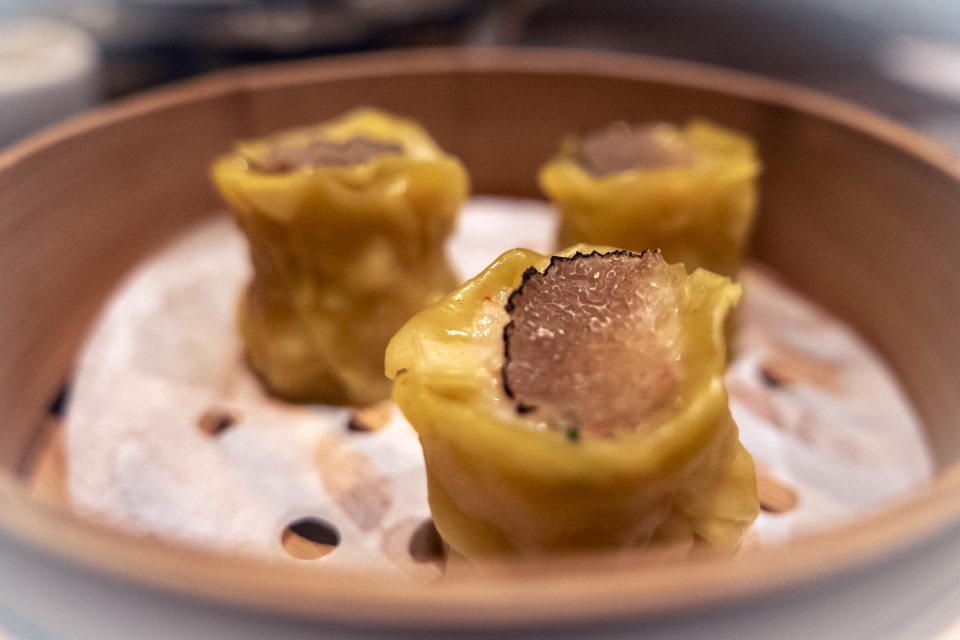 Фрагменты трюфеля, хотя и в более скромных объемах, обнаруживаются также и в ресторанчике Lotus Room. Для этого нужно взять димсамы с креветками (520). Их можно было бы назвать открытыми димсамами, но штука в том, что они как раз накрыты тоненькими слайсами трюфеля. Почему-то это ужасно трогательно смотрится. Девушки должны ронять слезу умиления.