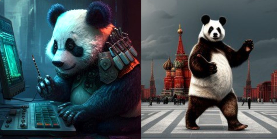Панд Жуи и Диндин попросили изобразить в разных стилях и разных локациях. В результате Жуи прогуливается по Красной площади, причем на задних лапах, а Диндин, видимо, пишет какой-то секретный код в киберпанк-вселенной.
