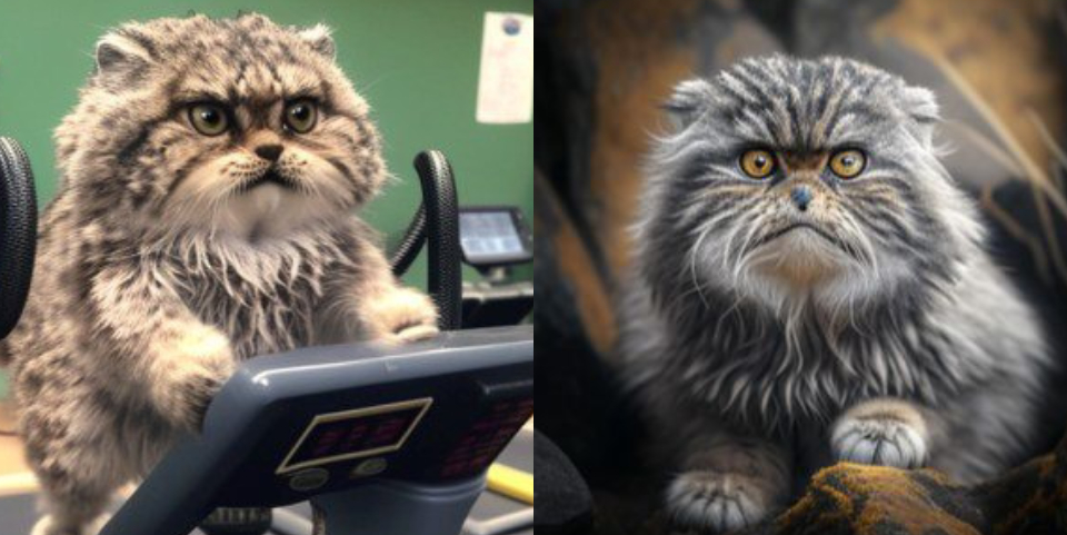 Первый запрос сотрудников зоопарка был нарисовать манула Тимофея, который худеет. Дело в том, что осенью все следили за его зажировкой (набором веса к зиме), а сейчас – весной – манул, наоборот, его сбрасывает. Нейросеть предположила, что Тимофей будет преображаться, занимаясь в спортзале.