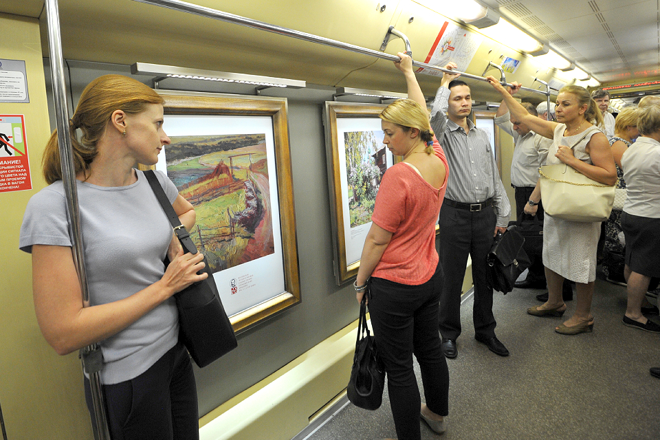 На Арбатско-Покровской линии есть своя картинная галерея на колесах. Стены в поезде «Акварель» увешаны стендами с полотнами художников — известных и новичков. Причем экспозиция занимает только одну сторону вагонов, на которой для этого убрали окна и сиденья. Стены и пол в салоне раскрашены в разные цвета. Около картин в рамах и с подсветкой — таблички с названием работы и информацией о художнике. Выставка регулярно обновляется. Например, в поезде пассажиры уже видели работы из коллекции Третьяковской галереи и музея изобразительных искусств имени Пушкина.