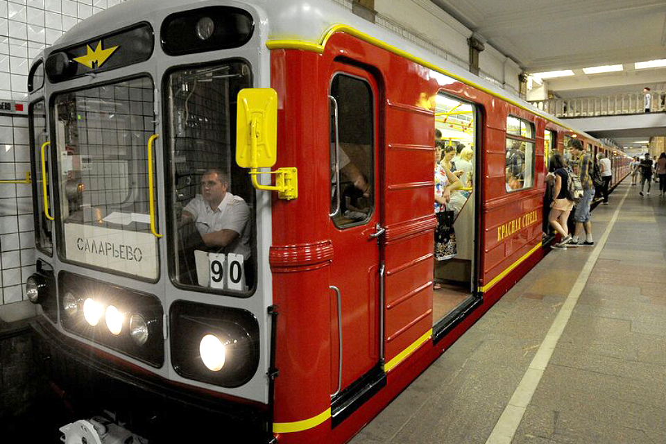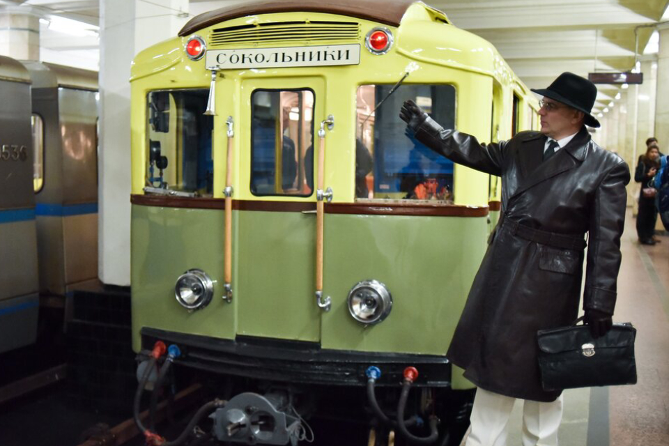 Ретро-поезд в стиле времен сталинской Москвы курсирует каждый день на Сокольнической линии. Кабину машиниста украшают две хромированные круглые фары, такие же, как в 30-е годы прошлого века. На бортах вагонов бежево-коричневого цвета — герб СССР. В салоне около окон под дерево — пружинные диваны, над ними — старинные светильники-бра. А стены обклеены плотной бумагой с тиснеными узорами под линкруст.