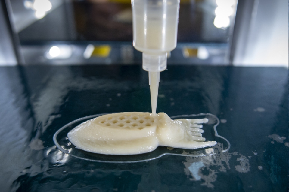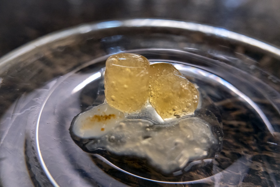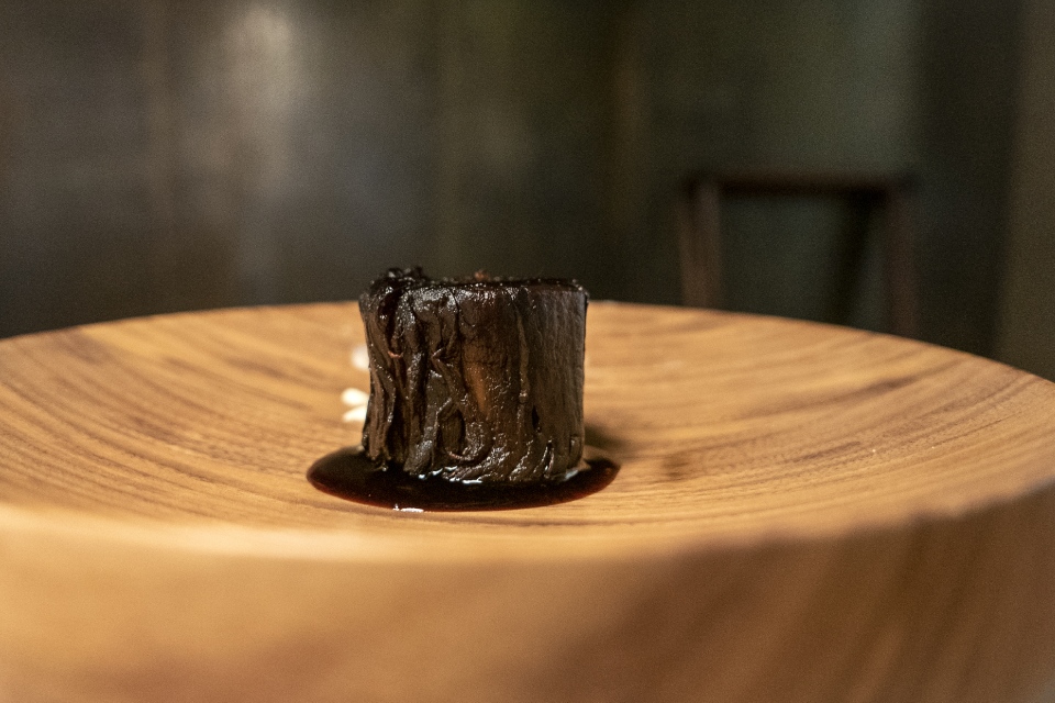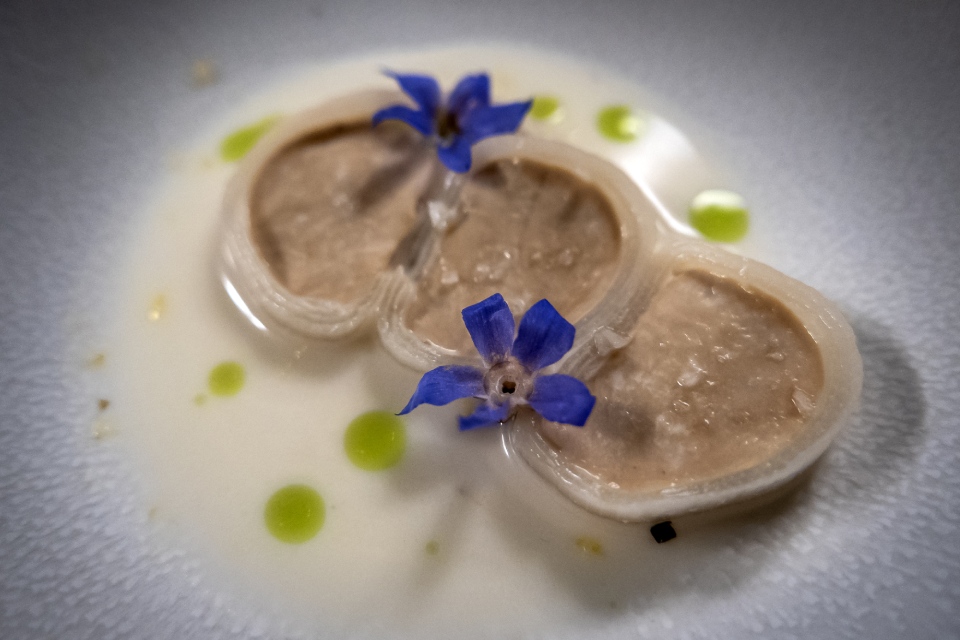 Главная сенсация из без того сенсационного сета. Кальмар, напечатанный на 3D био-принтере и полностью состоящий из растительного белка. Точнее — из фасолевой массы. Процесс «печати» — зрелище завораживающее и мало похожее на правду. Поначалу еще теплится надежда: ну нет, это не может получиться, ведь с виду же он не очень-то и похож на кальмара, он такой маленький, наверняка и по вкусу это будет что-то совсем другое. Но нет: он пахнет как кальмар, жуется как кальмар и по вкусу — самый настоящий кальмар. Для полноты ощущений подается с томатным вином, сделанным по методу солера.