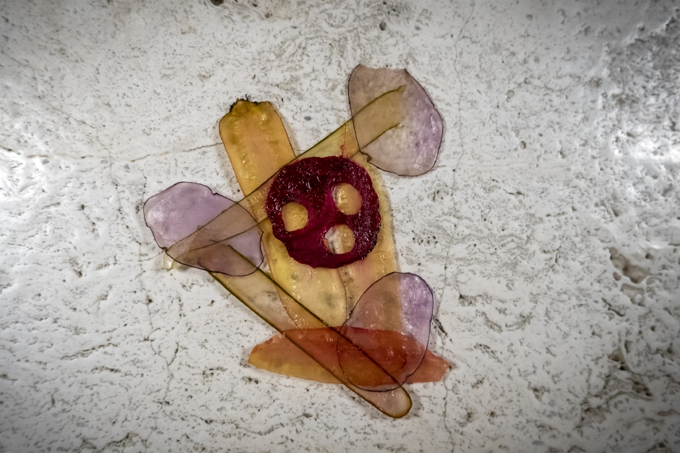 Предпоследний курс символизирует продление и сохранение жизни овощей — маринование и ферментацию. При виде сложного арт-объекта в красных тонах, вполне может возникнуть чувство замешательства. На самом деле все просто: главное тут — кисло-сладкий томат, притаившийся среди веток, его нужно просто взять рукой да и съесть. Жалко (мы же ему вроде жизнь хотели продлить?), но необходимо.