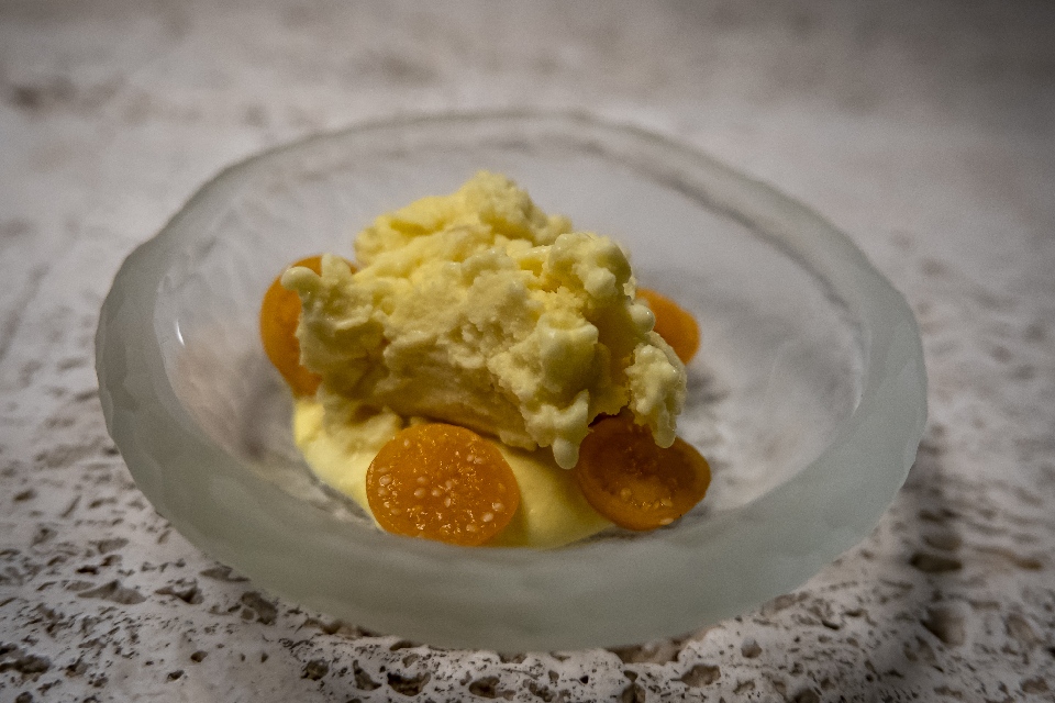 В старинной мороженице с деревянными (это важно) лопастями готовится кукурузное мороженое, в которое добавляют кукурузные палочки, а потом физалис. Винное сопровождение — херес из пастернака, выдержанный 2 года в дубовых бочках.
