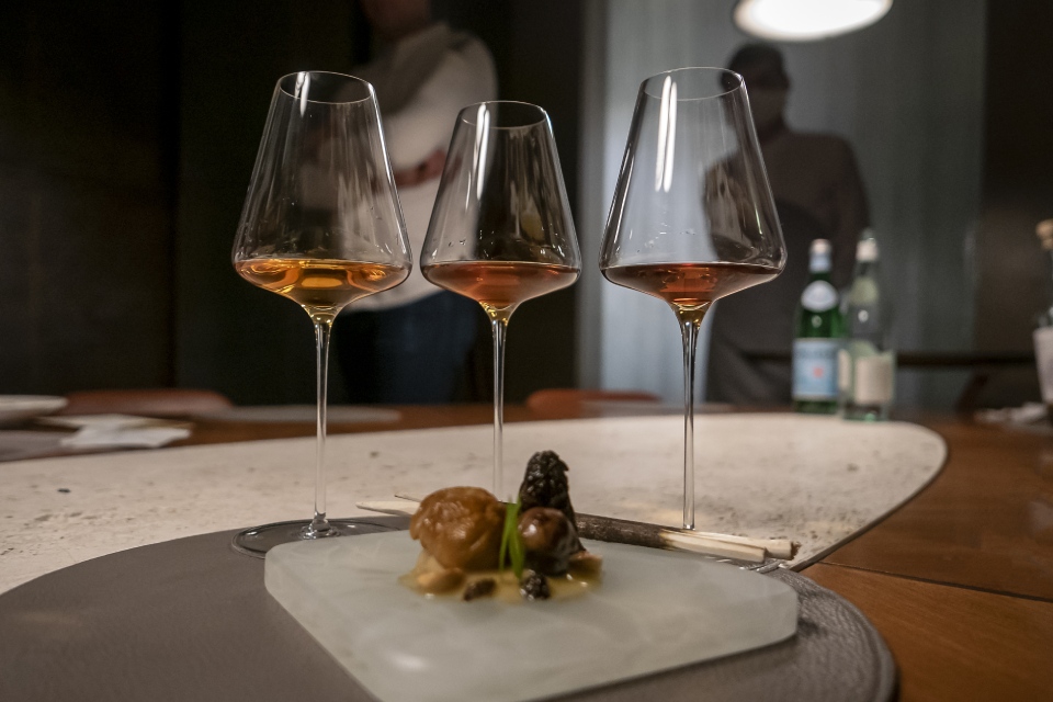 На тарелке три гриба — сморчок, подберёзовик и белый гриб с соусом на основе винного осадка. В бокалах три вина — из сморчка, подберезовика и белого гриба. Не зря говорили в древности на Руси, «каждому грибу — свое вино». Крохотные маринованные сосновые шишки выполняют роль освежителей вкусовых рецепторов при переходе от одной винно-грибной пары к другой. Работает наподобие васаби между разными суши.