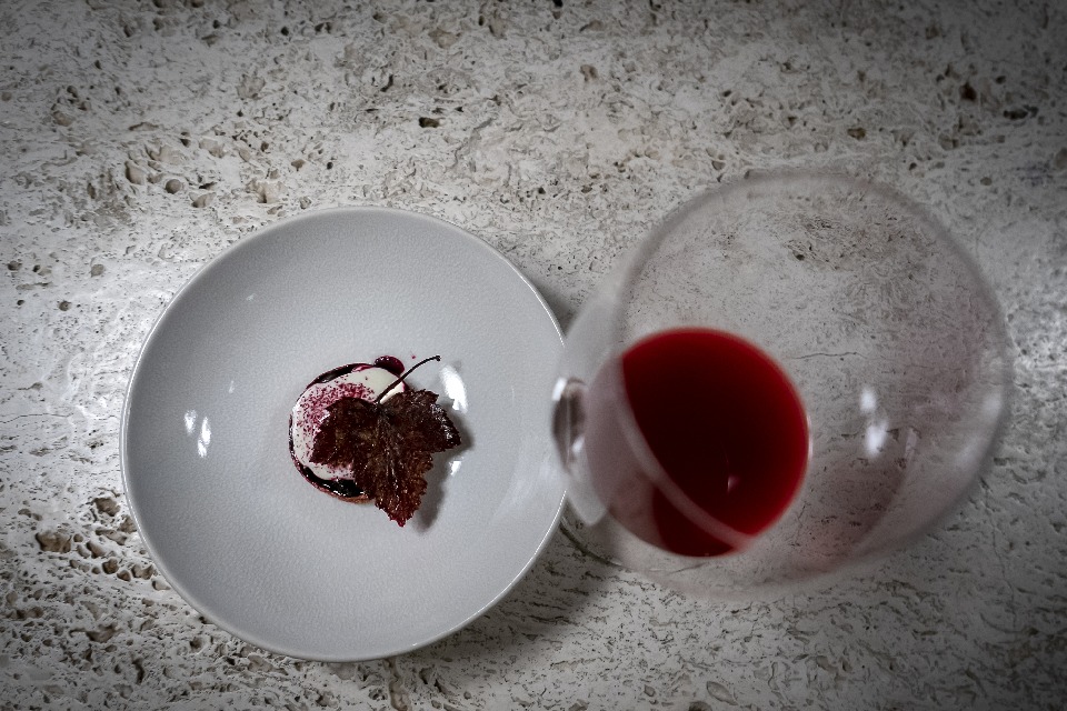 Пирог из вяленой в печи свеклы с чёрной смородиной, муссом из козьего сыра и листьев чёрной смородины. Тесто из орехов. Вино — из свёклы, вы это поймете, едва поднеся бокал к носу. Тут, пожалуй, наиболее отчетливая связь исходного продукта и конечного результата. Аромат, вкус, послевкусие — все свекла.
