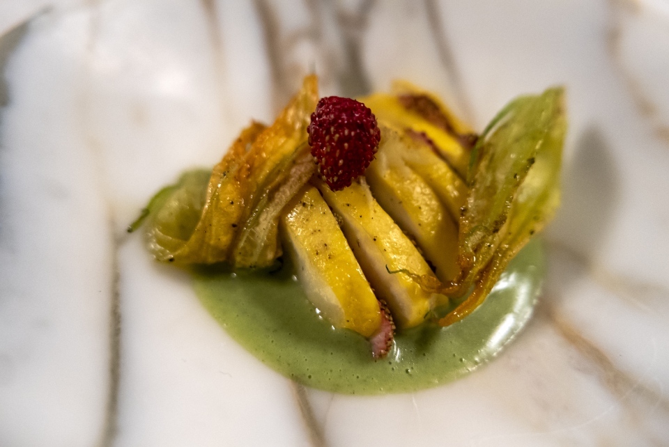 С первого взгляда понятно: что-то тут не так. Какие цветы, когда на тарелке куриная котлетка на косточке? Разгадка: курица — это цветок кабачка, фаршированный лисичками и персиками, косточка — из грибного паштета.