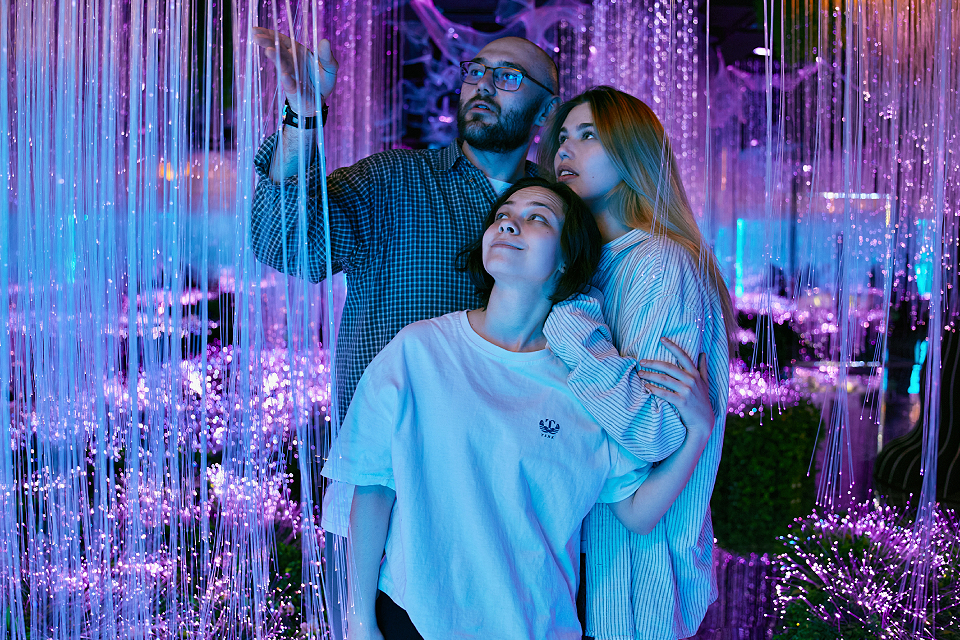 Каждый уголок создан с помощью мультимедийных технологий и искусственного интеллекта. В четырех зонах расположились неоновые локации, зеркальные лабиринты и даже мерцающая трава: