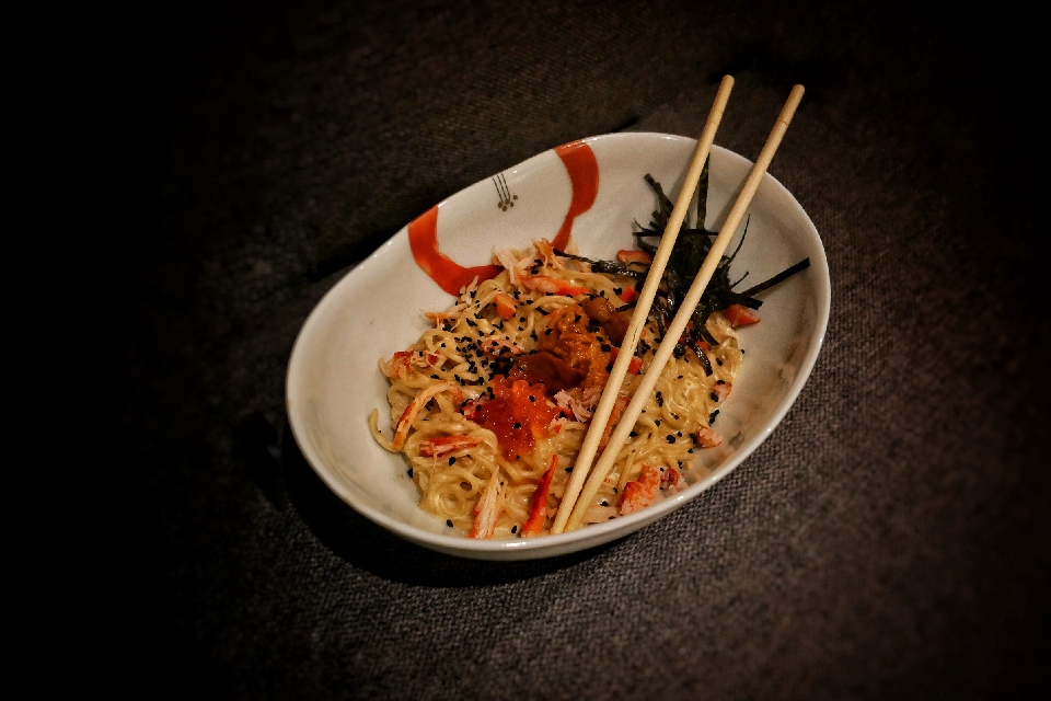 Гедза, жареный тофу, кушияки нескольких видов, тонкацу – все на месте. Лучшее в разделе сашими – сладкая креветка в пряном соусе понзу (390). Тунец кацу в панировке (590) – чистая классика, как и многое другое тут, в оценочных суждениях не нуждается. Больше всего понравился мезмен с крабом, икрой морского ежа и красной икрой (690). Но имейте в виду: это блюдо надо есть, едва только оно появится на столе. Чуть замешкаетесь – и узнаете, какими выдающимися цементирующими свойствами обладает сливочно-устричный соус, превращающий лапшу вместе со всеми добавками в нежующуюся массу.