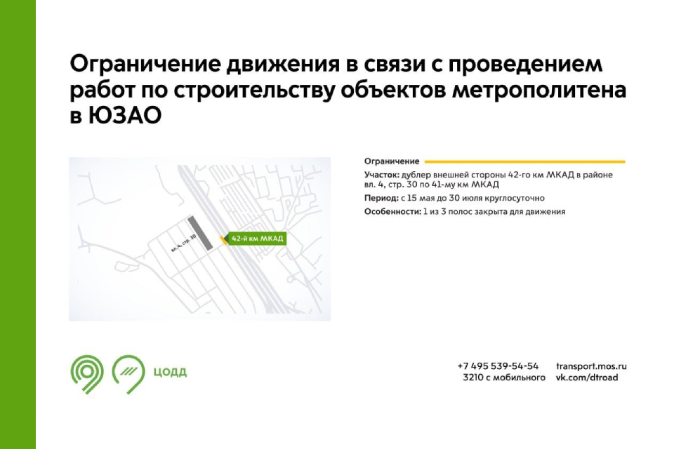 Несколько полос для движения будет закрыто до 10 марта 2024-го и на участках улицы Академика Семенова. До 20 февраля 2024 – одна полоса на улице Жебрунова. А до 30 июля из-за строительства метро круглосуточно недоступна для движения 1 из 3 полос на участке дублера внешней стороны 42-го километра МКАД.