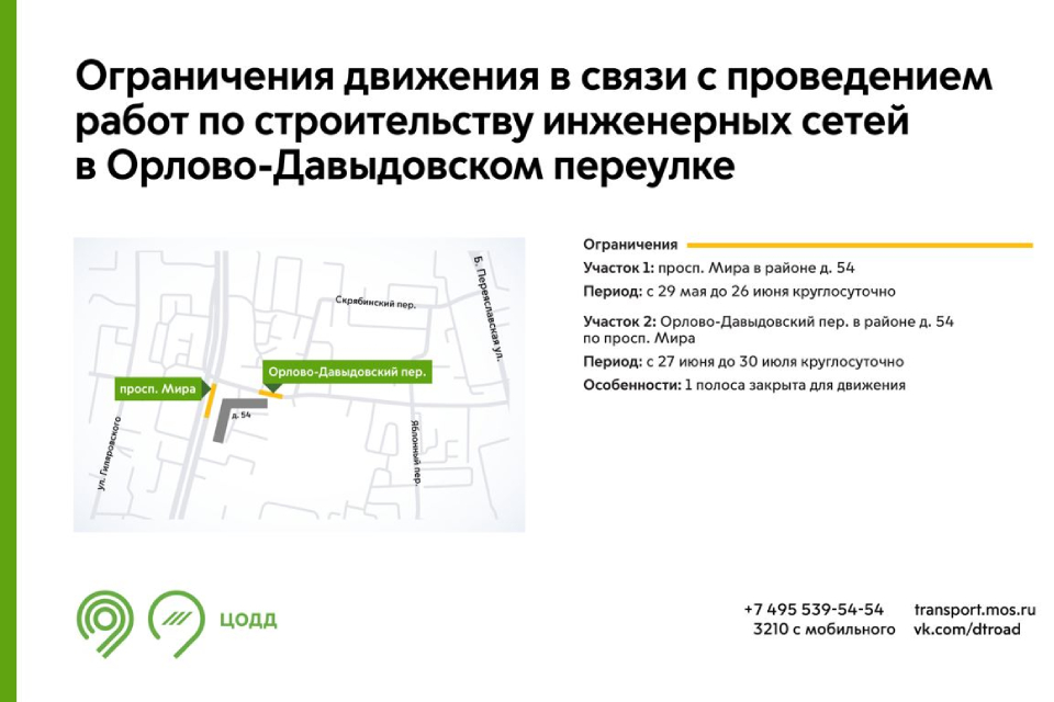 С 29 мая по 26 июня нельзя будет проехать по одной полосе на проспекте Мира в районе дома 54, а с 27 июня по 30 июля — в Орлово-Давыдовском переулке в районе дома 54 по проспекту Мира.