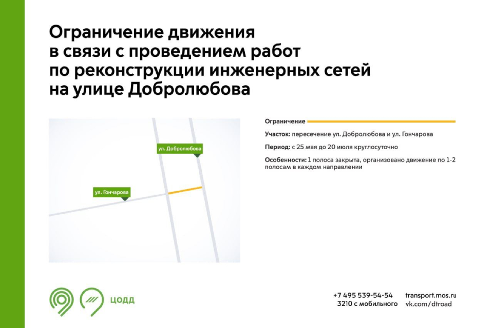 В связи с проведением работ по ремонту инженерных сетей на улице Добролюбова с 25 мая по 20 июля 2023 будет закрыта для движения одна полоса. До 25 июля перекроют 1 из 2 полос в каждом направлении на участке Семеновского путепровода от улицы Госпитальный Вал до Семеновского проезда.