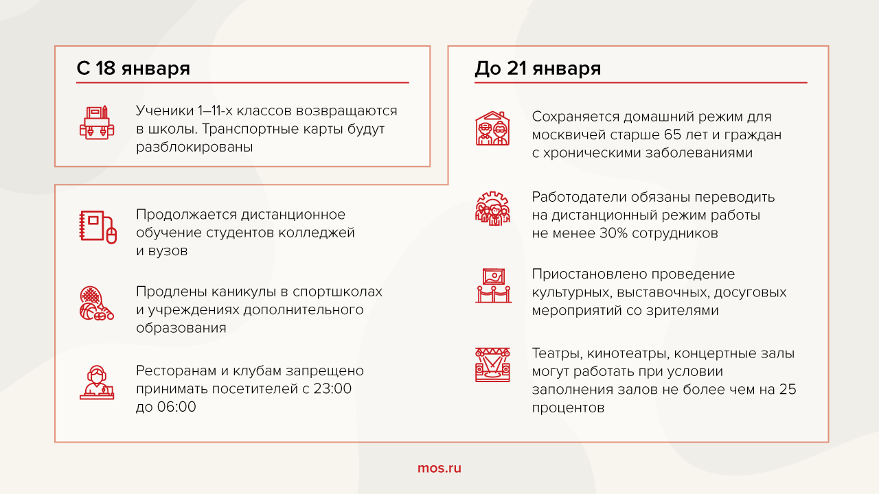 Он отметил, что если не произойдет ухудшения и ситуация продолжит стабилизироваться, власти рассмотрят возможность смягчения ряда ограничений. Пока послабление сделали только для школьников – 18 января 2021 гола они выходят на учебу. Студенты же колледжей и вузов остаются на дистанционке. Пожилые и люди с хроническими заболеваниями должны оставаться дома.